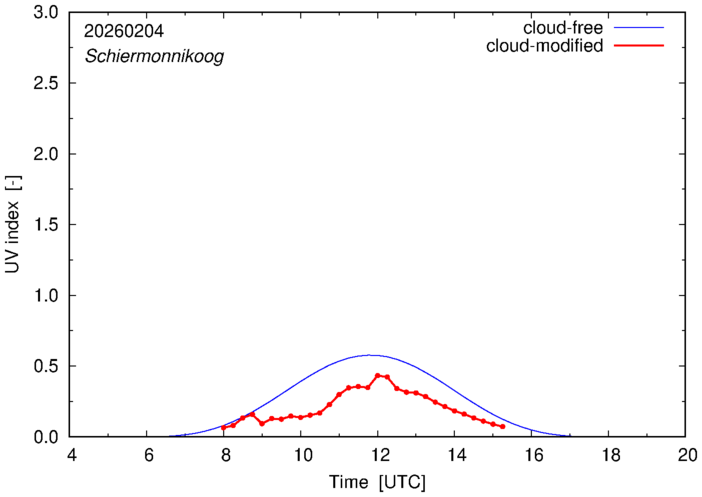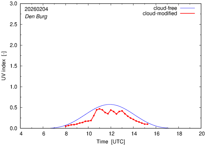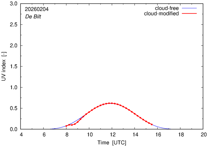 The plots on this page show for selected places in The Netherlands the UV index throughout the day, both cloud-free (thin blue line) and cloud-modified (red line/points) -- if the latter is absent, then cloud cover data is not available.