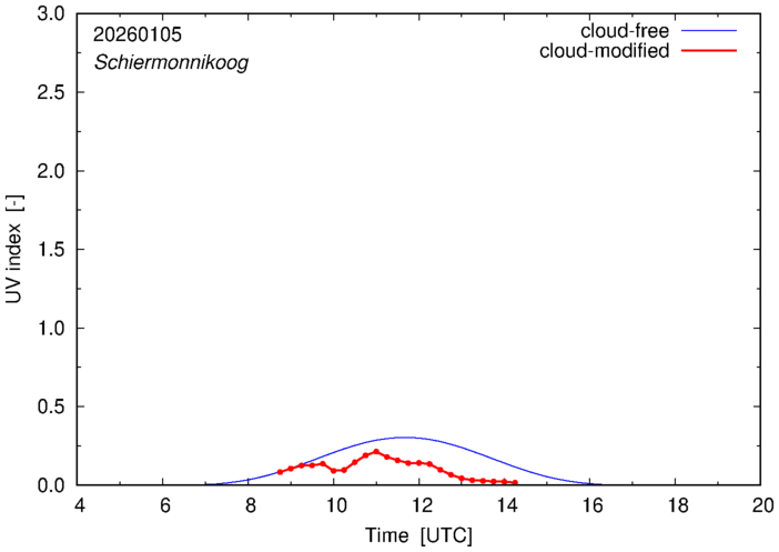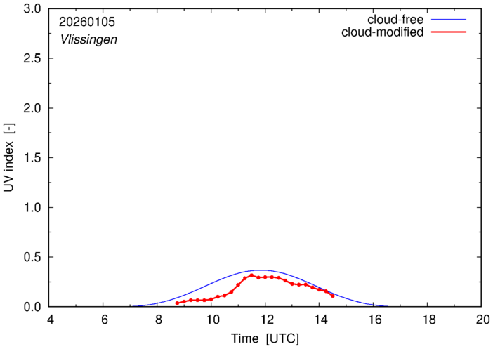 The plots on this page show for selected places in The Netherlands the UV index throughout the day, both cloud-free (thin blue line) and cloud-modified (red line/points) -- if the latter is absent, then cloud cover data is not available.