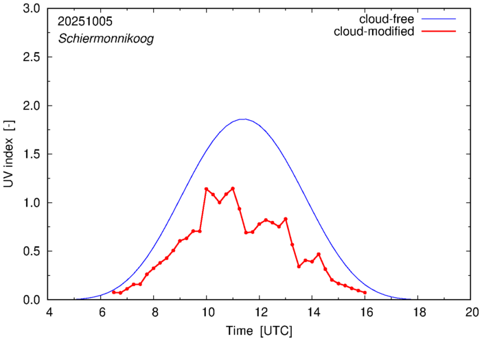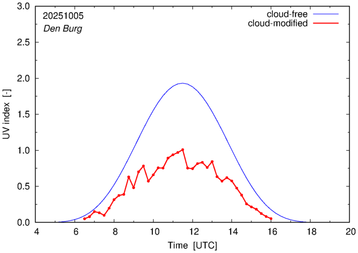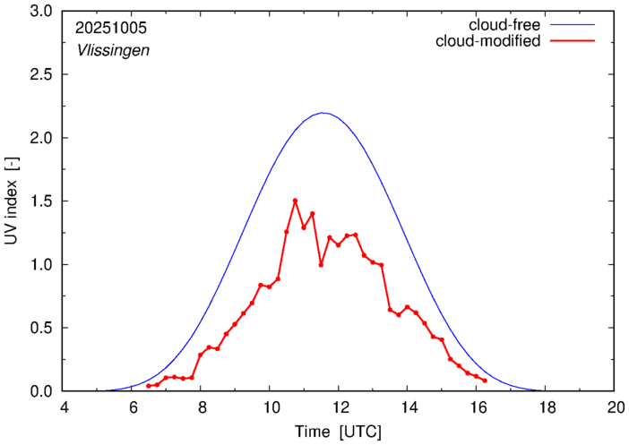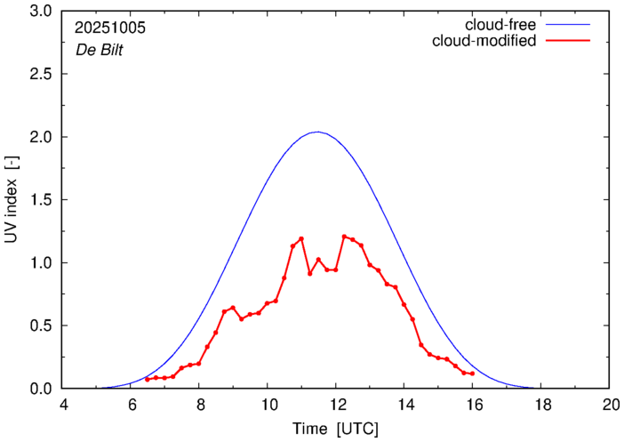 The plots on this page show for selected places in The Netherlands the UV index throughout the day, both cloud-free (thin blue line) and cloud-modified (red line/points) -- if the latter is absent, then cloud cover data is not available.