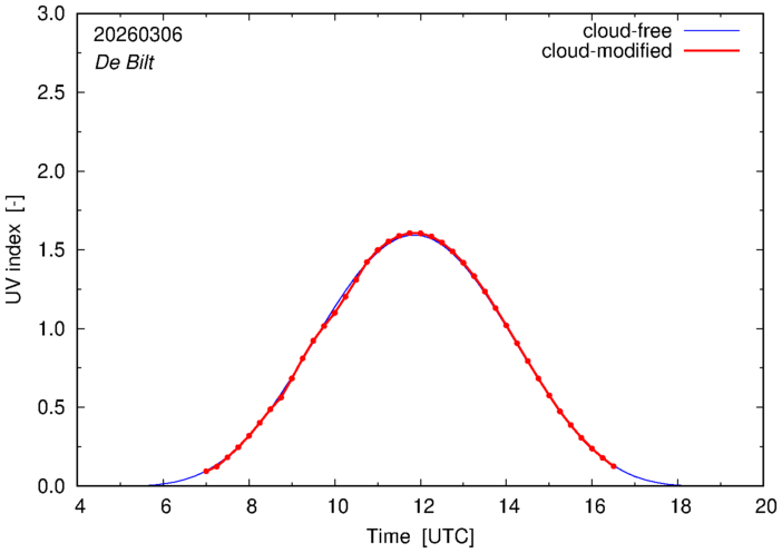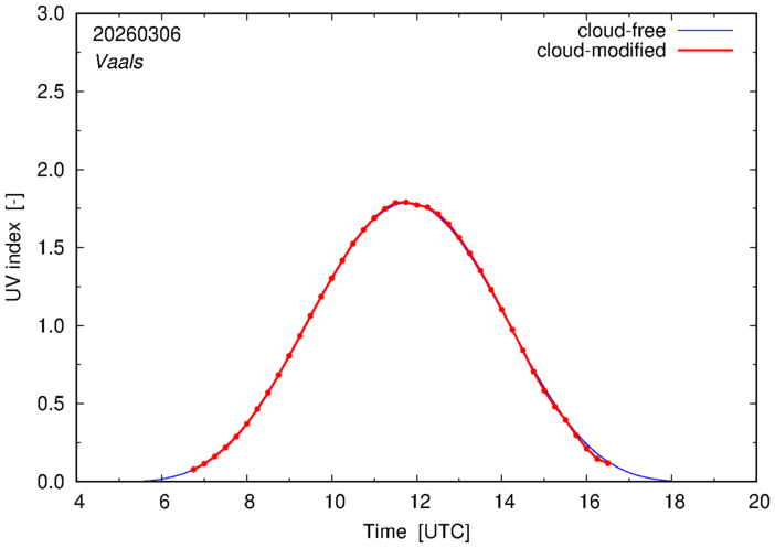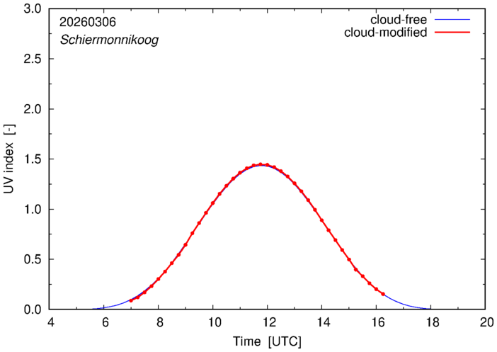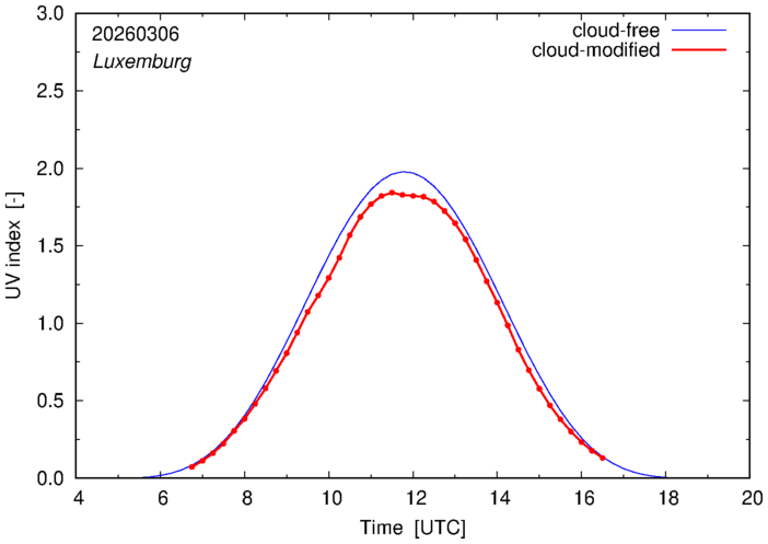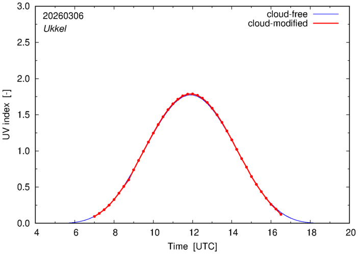 Example plots of the cloud-free and cloud-modified UV index at 12:00 UTC