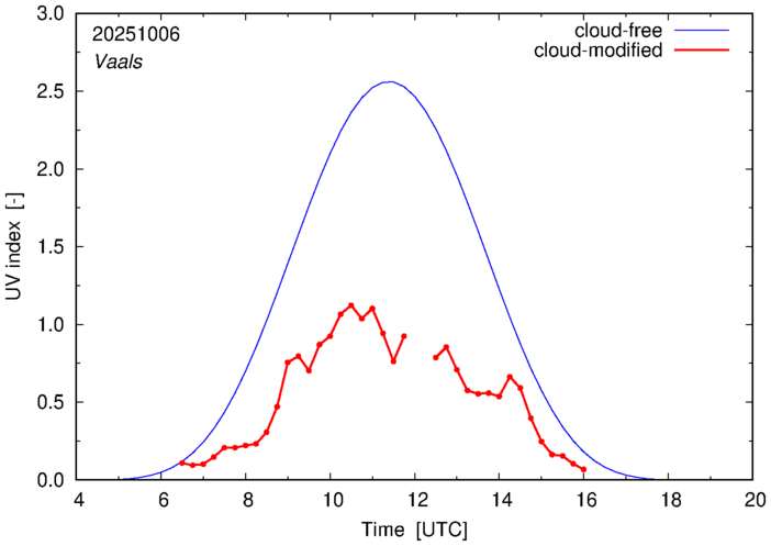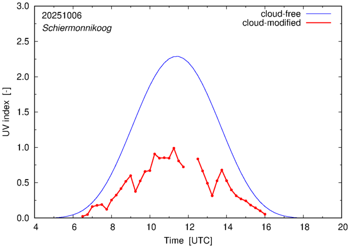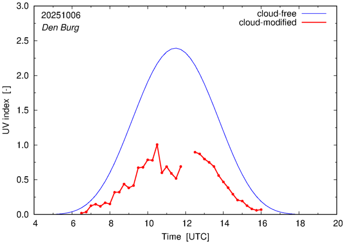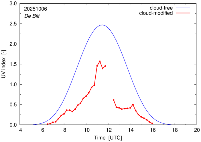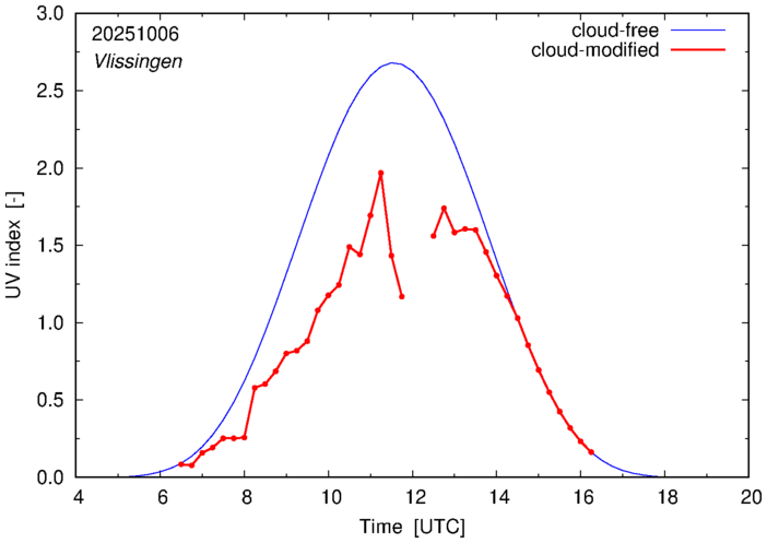 The plots on this page show for selected places in The Netherlands the UV index throughout the day, both cloud-free (thin blue line) and cloud-modified (red line/points) -- if the latter is absent, then cloud cover data is not available.