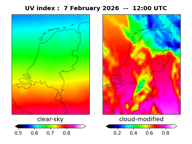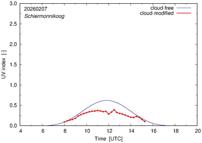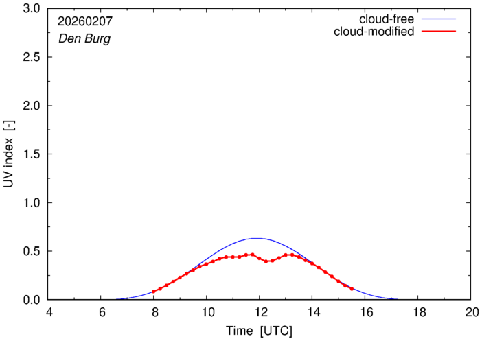 The plots on this page show for selected places in The Netherlands the UV index throughout the day, both cloud-free (thin blue line) and cloud-modified (red line/points) -- if the latter is absent, then cloud cover data is not available.
