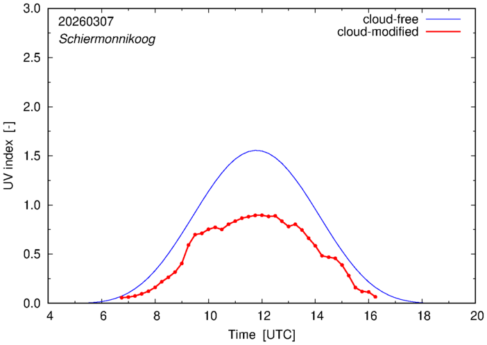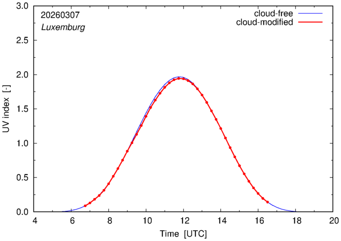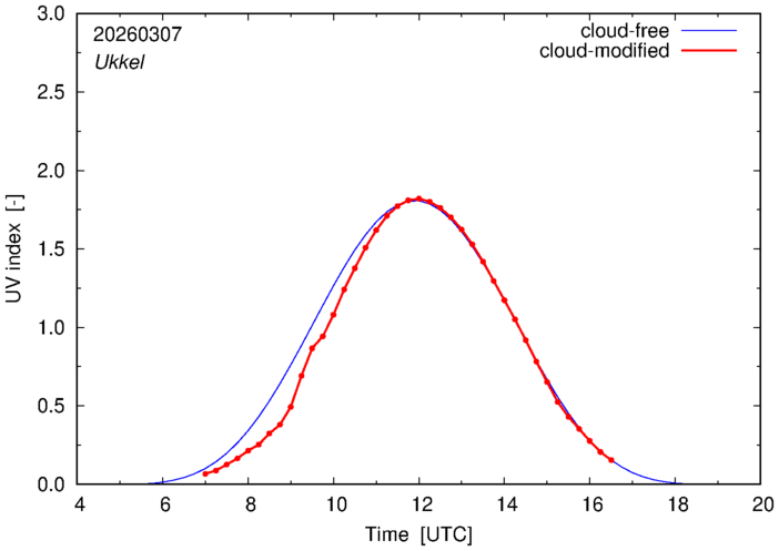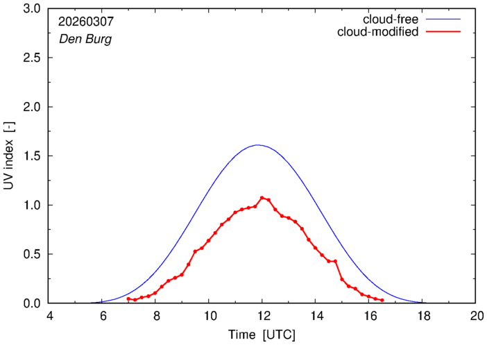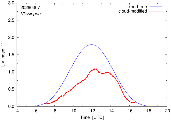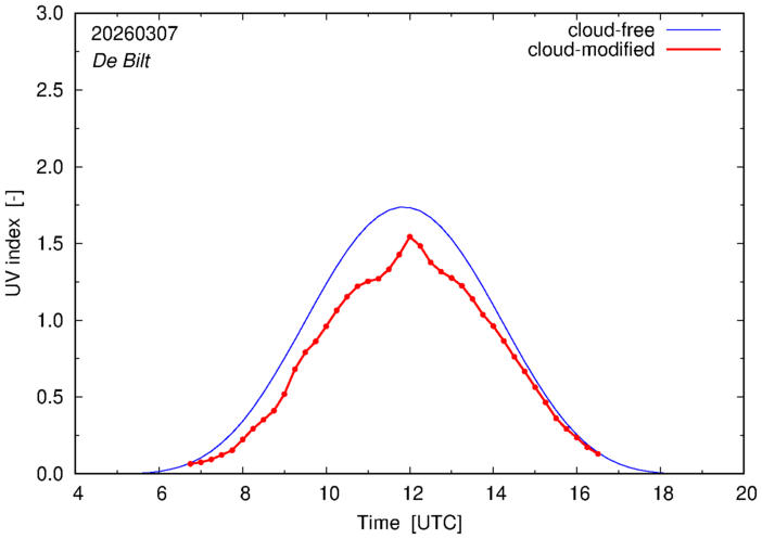 The plots on this page show for selected places in The Netherlands or the Benelux (as of 16 February 2026) the UV index throughout the day, both cloud-free (thin blue line) and cloud-modified (red line/points) -- if the latter is absent, then cloud cover data is not available.