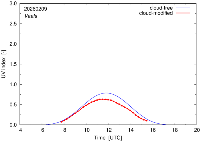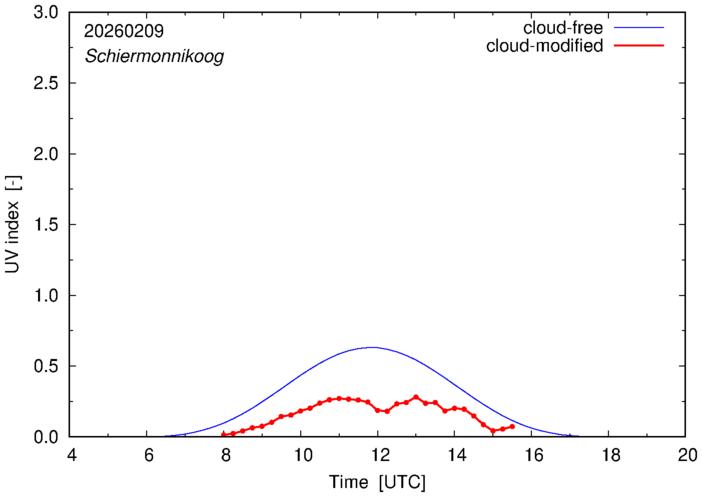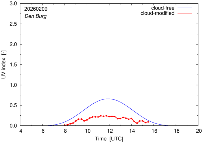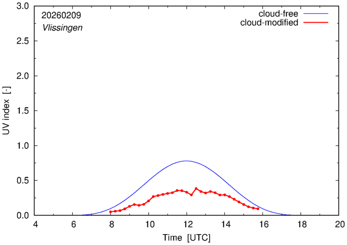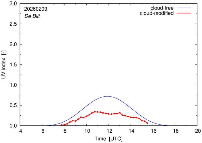 The plots on this page show for selected places in The Netherlands the UV index throughout the day, both cloud-free (thin blue line) and cloud-modified (red line/points) -- if the latter is absent, then cloud cover data is not available.