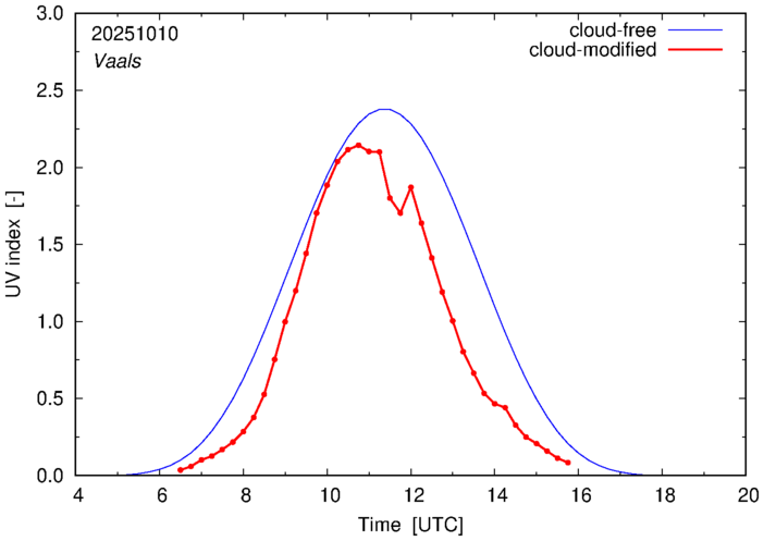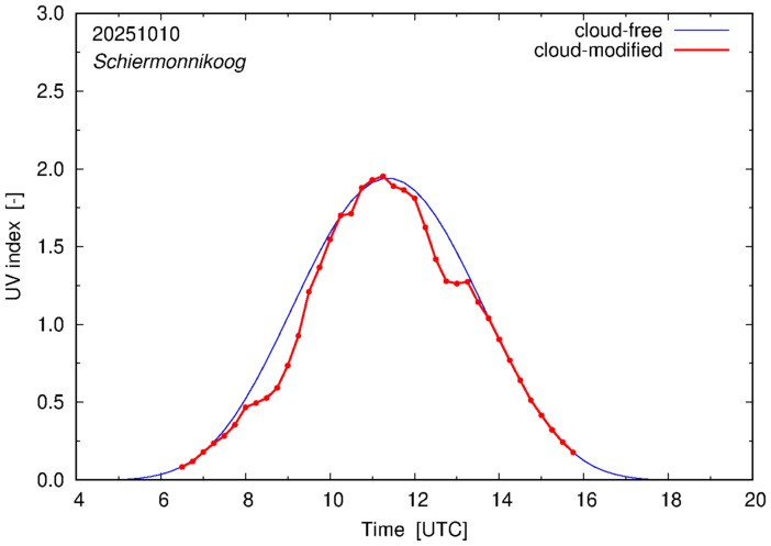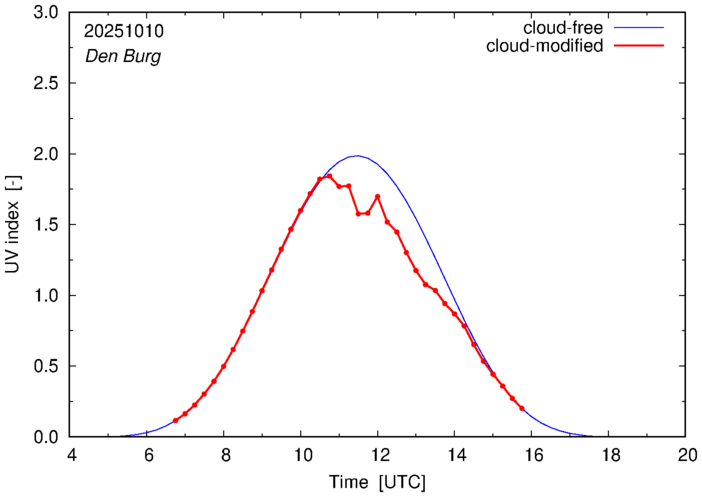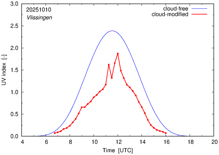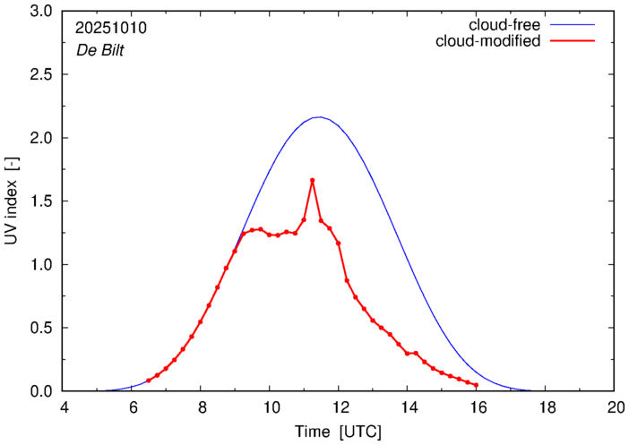 The plots on this page show for selected places in The Netherlands the UV index throughout the day, both cloud-free (thin blue line) and cloud-modified (red line/points) -- if the latter is absent, then cloud cover data is not available.