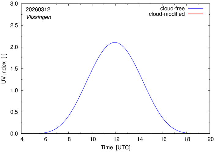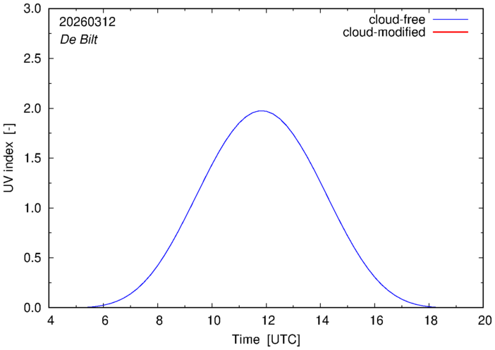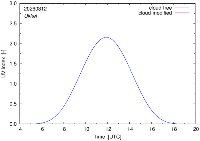 Example plots of the cloud-free and cloud-modified UV index at 12:00 UTC