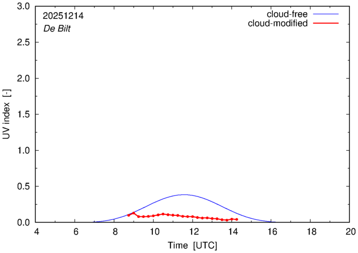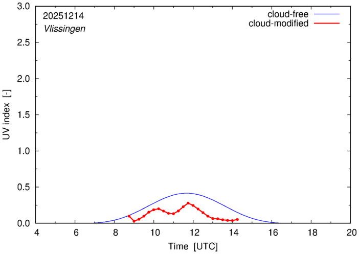The plots on this page show for selected places in The Netherlands the UV index throughout the day, both cloud-free (thin blue line) and cloud-modified (red line/points) -- if the latter is absent, then cloud cover data is not available.