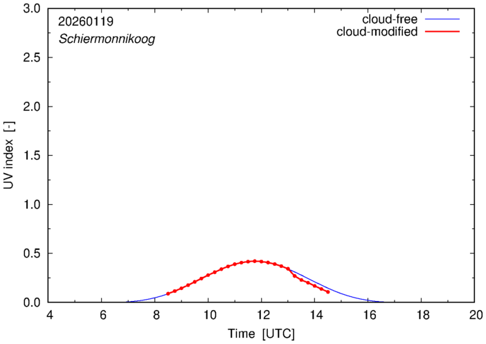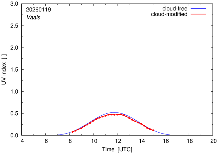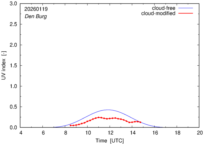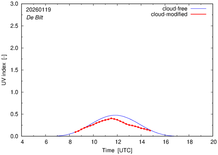 The plots on this page show for selected places in The Netherlands the UV index throughout the day, both cloud-free (thin blue line) and cloud-modified (red line/points) -- if the latter is absent, then cloud cover data is not available.