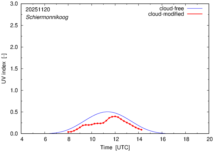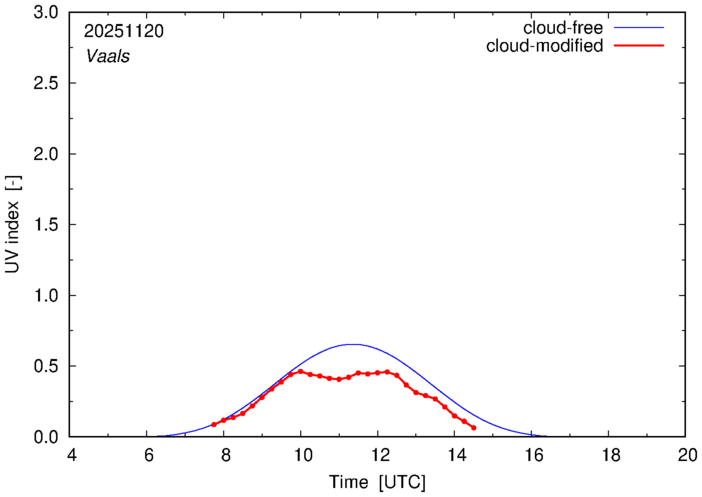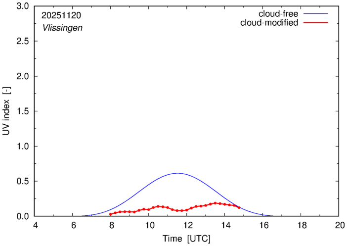 The plots on this page show for selected places in The Netherlands the UV index throughout the day, both cloud-free (thin blue line) and cloud-modified (red line/points) -- if the latter is absent, then cloud cover data is not available.