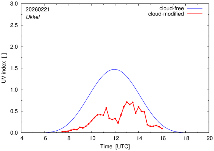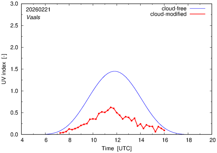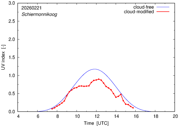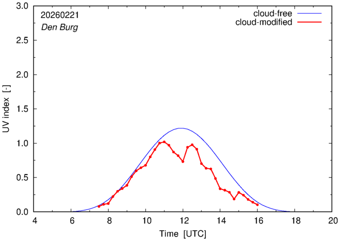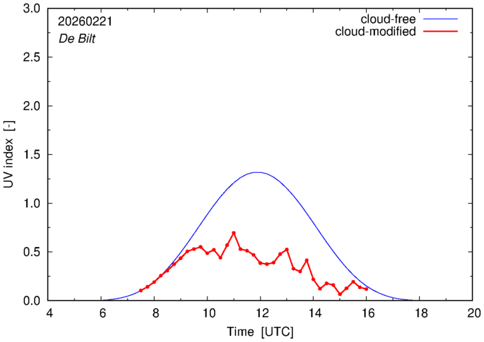 The plots on this page show for selected places in The Netherlands or the Benelux (as of 16 February 2026) the UV index throughout the day, both cloud-free (thin blue line) and cloud-modified (red line/points) -- if the latter is absent, then cloud cover data is not available.
