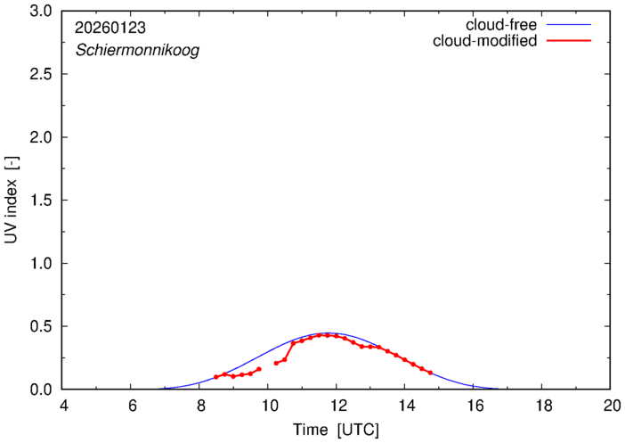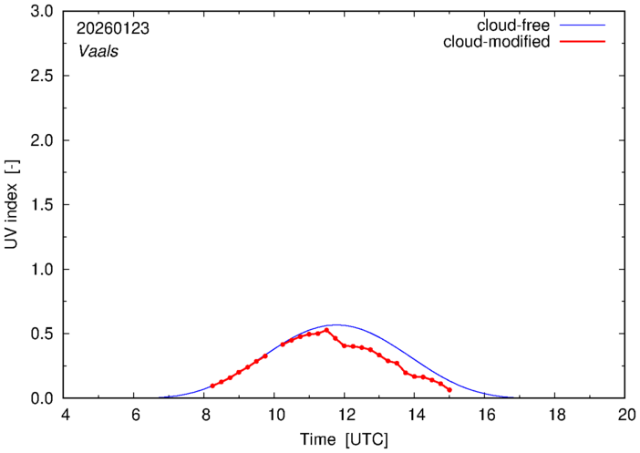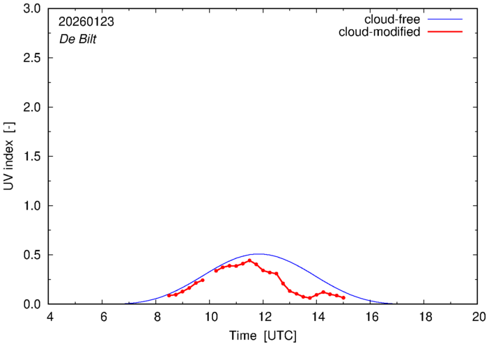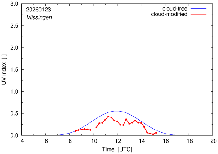 The plots on this page show for selected places in The Netherlands the UV index throughout the day, both cloud-free (thin blue line) and cloud-modified (red line/points) -- if the latter is absent, then cloud cover data is not available.
