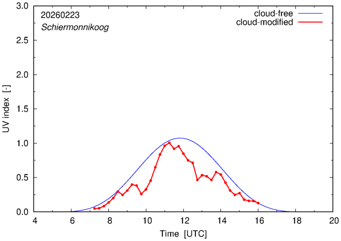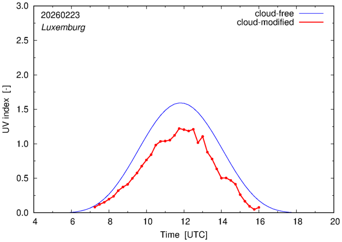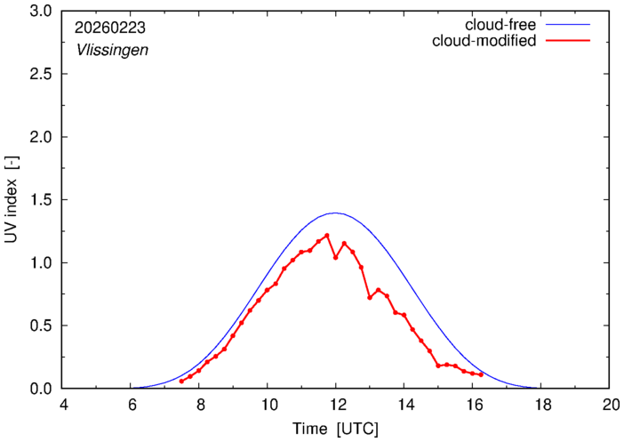 The plots on this page show for selected places in The Netherlands or the Benelux (as of 16 February 2026) the UV index throughout the day, both cloud-free (thin blue line) and cloud-modified (red line/points) -- if the latter is absent, then cloud cover data is not available.