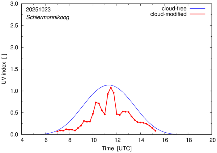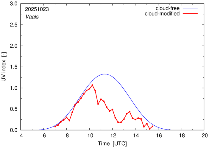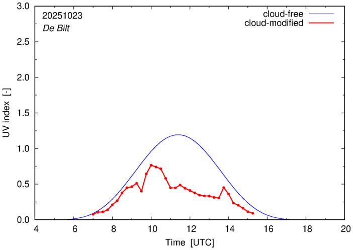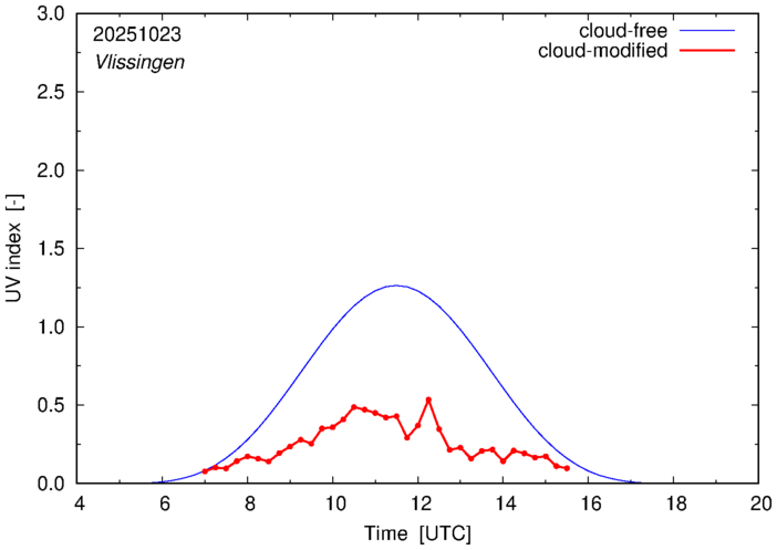 The plots on this page show for selected places in The Netherlands the UV index throughout the day, both cloud-free (thin blue line) and cloud-modified (red line/points) -- if the latter is absent, then cloud cover data is not available.