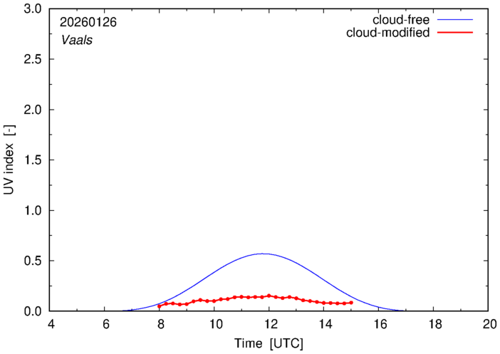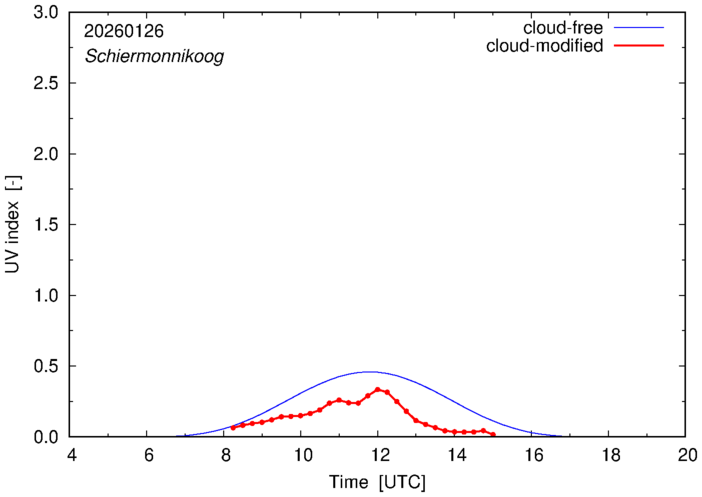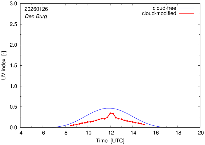 The plots on this page show for selected places in The Netherlands the UV index throughout the day, both cloud-free (thin blue line) and cloud-modified (red line/points) -- if the latter is absent, then cloud cover data is not available.