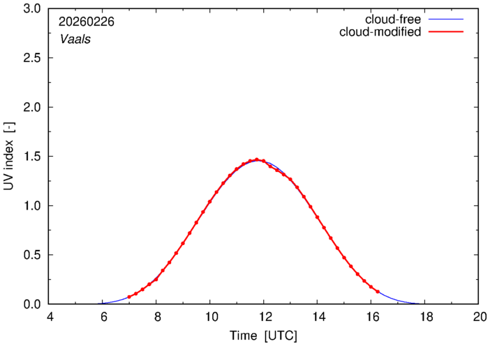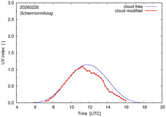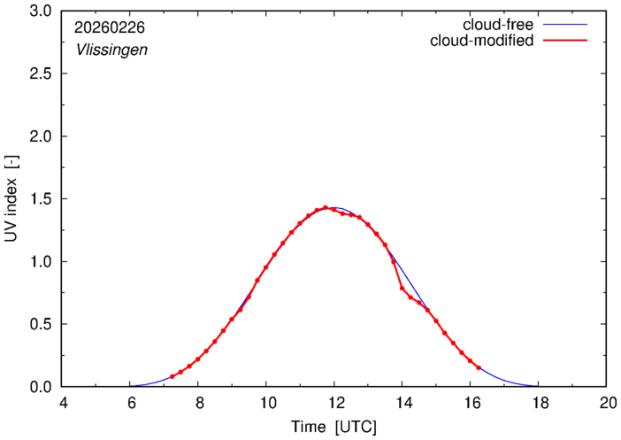 The plots on this page show for selected places in The Netherlands or the Benelux (as of 16 February 2026) the UV index throughout the day, both cloud-free (thin blue line) and cloud-modified (red line/points) -- if the latter is absent, then cloud cover data is not available.