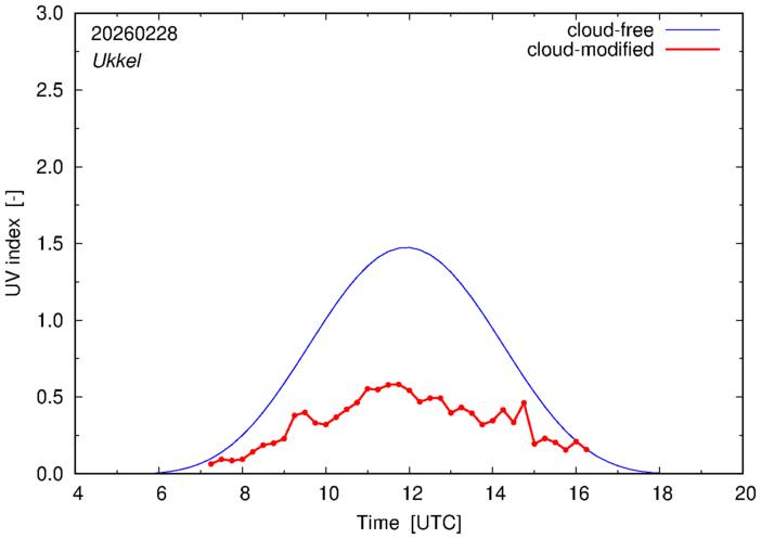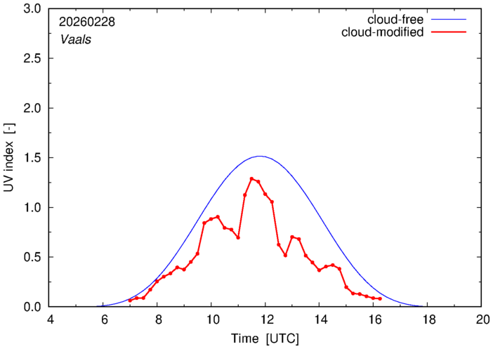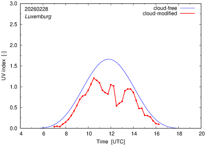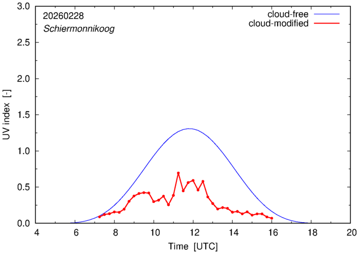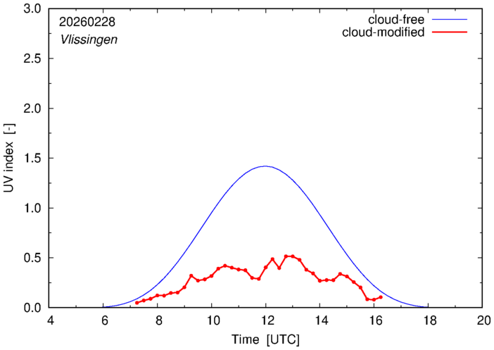 The plots on this page show for selected places in The Netherlands or the Benelux (as of 16 February 2026) the UV index throughout the day, both cloud-free (thin blue line) and cloud-modified (red line/points) -- if the latter is absent, then cloud cover data is not available.