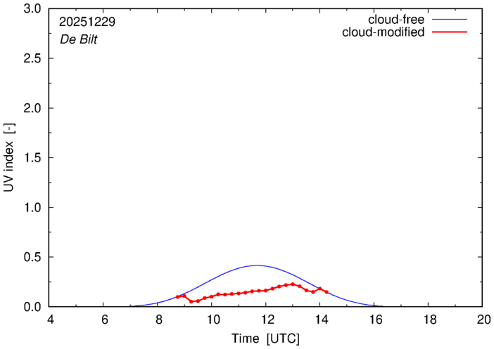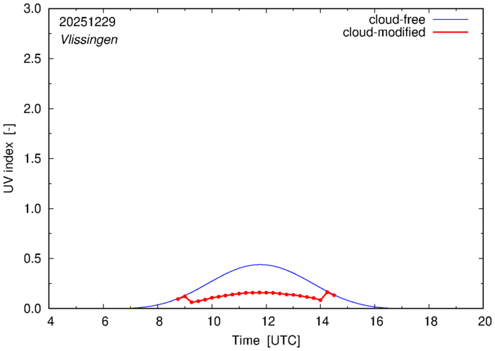 The plots on this page show for selected places in The Netherlands the UV index throughout the day, both cloud-free (thin blue line) and cloud-modified (red line/points) -- if the latter is absent, then cloud cover data is not available.