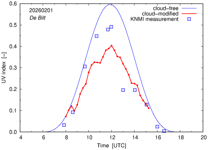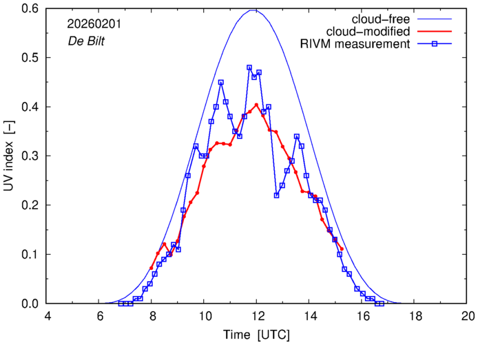 Comparison of the cloud-modified UV index with RIVM and KNMI UV index measurements is based on the higher resolution (0.05 by 0.05°) data using the location of 'De Bilt' for both institutes and is available up to yesterday.