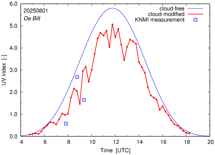 Comparison of the cloud-modified UV index with RIVM and KNMI UV index measurements is based on the higher resolution (0.05 by 0.05°) data using the location of 'De Bilt' for both institutes and is available up to yesterday.