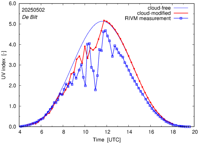 Comparison of the cloud-modified UV index with RIVM and KNMI UV index measurements is based on the higher resolution (0.05 by 0.05°) data using the location of 'De Bilt' for both institutes and is available up to yesterday.
