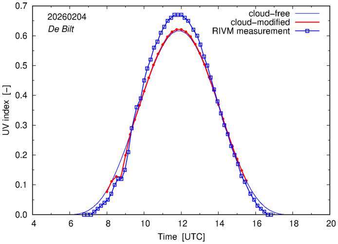 Comparison of the cloud-modified UV index with RIVM and KNMI UV index measurements is based on the higher resolution (0.05 by 0.05°) data using the location of 'De Bilt' for both institutes and is available up to yesterday.