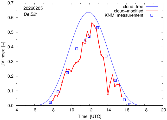 Comparison of the cloud-modified UV index with RIVM and KNMI UV index measurements is based on the higher resolution (0.05 by 0.05°) data using the location of 'De Bilt' for both institutes and is available up to yesterday.