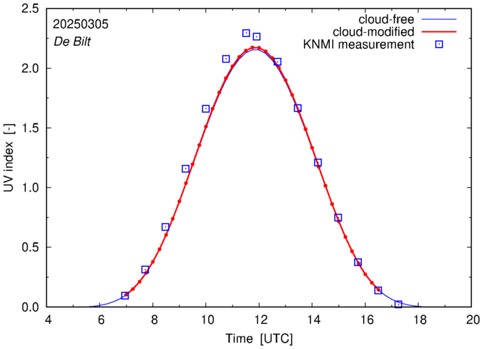 Comparison of the cloud-modified UV index with RIVM and KNMI UV index measurements is based on the higher resolution (0.05 by 0.05°) data using the location of 'De Bilt' for both institutes and is available up to yesterday.