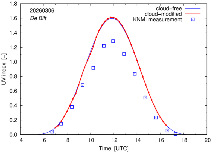 Comparison of the cloud-modified UV index with RIVM and KNMI UV index measurements is based on the higher resolution (0.05 by 0.05°) data using the location of 'De Bilt' for both institutes and is available up to yesterday.