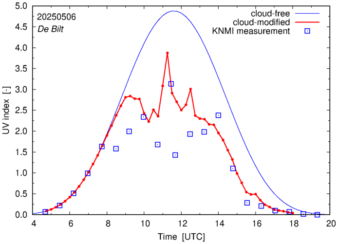 Comparison of the cloud-modified UV index with RIVM and KNMI UV index measurements is based on the higher resolution (0.05 by 0.05°) data using the location of 'De Bilt' for both institutes and is available up to yesterday.