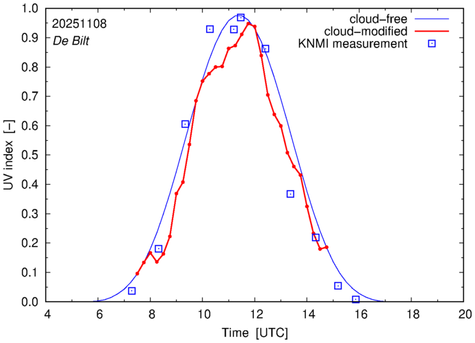 Comparison of the cloud-modified UV index with RIVM and KNMI UV index measurements is based on the higher resolution (0.05 by 0.05°) data using the location of 'De Bilt' for both institutes and is available up to yesterday.