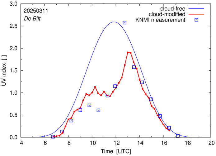 Comparison of the cloud-modified UV index with RIVM and KNMI UV index measurements is based on the higher resolution (0.05 by 0.05°) data using the location of 'De Bilt' for both institutes and is available up to yesterday.