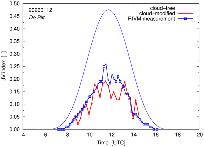 Comparison of the cloud-modified UV index with RIVM and KNMI UV index measurements is based on the higher resolution (0.05 by 0.05°) data using the location of 'De Bilt' for both institutes and is available up to yesterday.