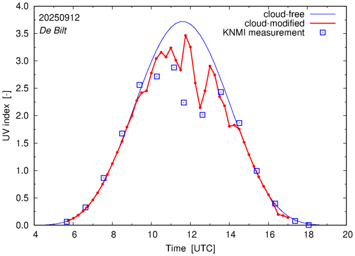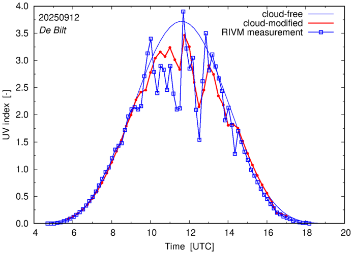 Comparison of the cloud-modified UV index with RIVM and KNMI UV index measurements is based on the higher resolution (0.05 by 0.05°) data using the location of 'De Bilt' for both institutes and is available up to yesterday.