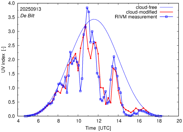Comparison of the cloud-modified UV index with RIVM and KNMI UV index measurements is based on the higher resolution (0.05 by 0.05°) data using the location of 'De Bilt' for both institutes and is available up to yesterday.