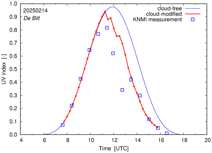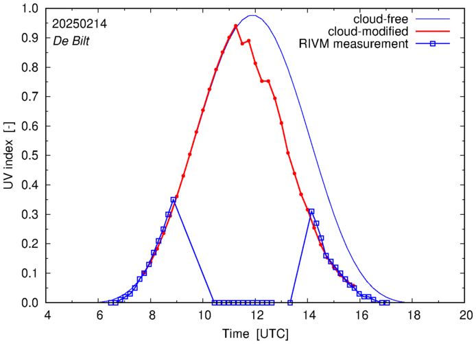 Comparison of the cloud-modified UV index with RIVM and KNMI UV index measurements is based on the higher resolution (0.05 by 0.05°) data using the location of 'De Bilt' for both institutes and is available up to yesterday.