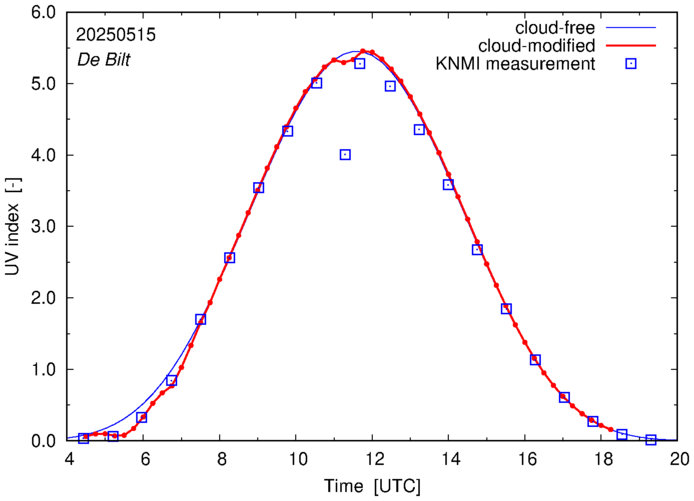 Comparison of the cloud-modified UV index with RIVM and KNMI UV index measurements is based on the higher resolution (0.05 by 0.05°) data using the location of 'De Bilt' for both institutes and is available up to yesterday.