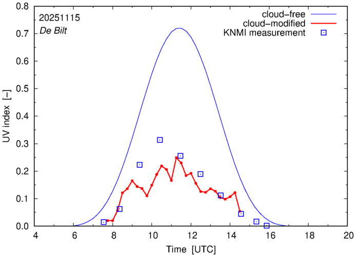 Comparison of the cloud-modified UV index with RIVM and KNMI UV index measurements is based on the higher resolution (0.05 by 0.05°) data using the location of 'De Bilt' for both institutes and is available up to yesterday.