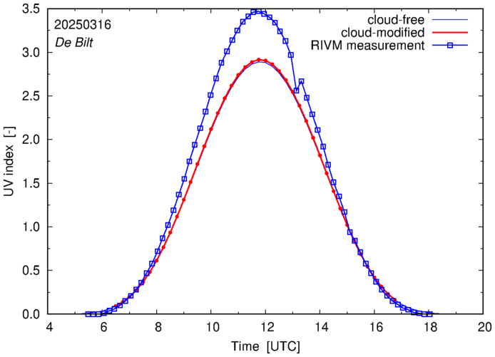 Comparison of the cloud-modified UV index with RIVM and KNMI UV index measurements is based on the higher resolution (0.05 by 0.05°) data using the location of 'De Bilt' for both institutes and is available up to yesterday.