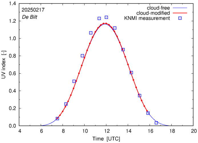 Comparison of the cloud-modified UV index with RIVM and KNMI UV index measurements is based on the higher resolution (0.05 by 0.05°) data using the location of 'De Bilt' for both institutes and is available up to yesterday.