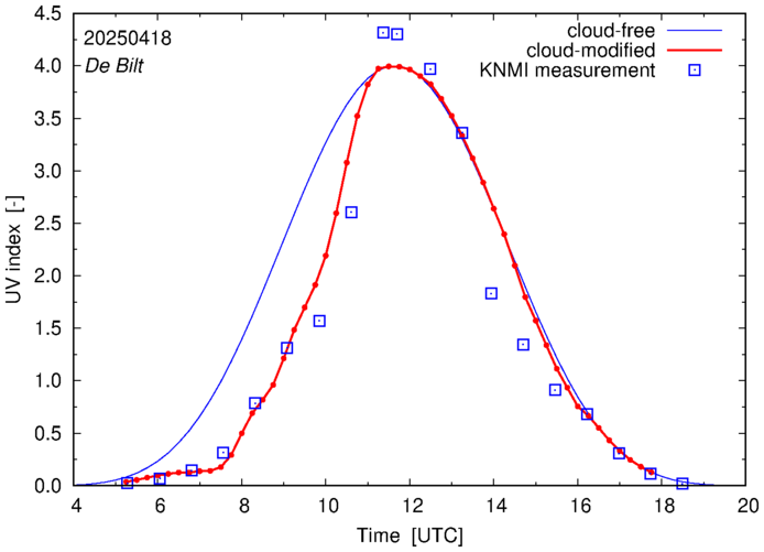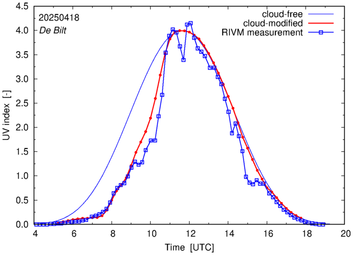 Comparison of the cloud-modified UV index with RIVM and KNMI UV index measurements is based on the higher resolution (0.05 by 0.05°) data using the location of 'De Bilt' for both institutes and is available up to yesterday.