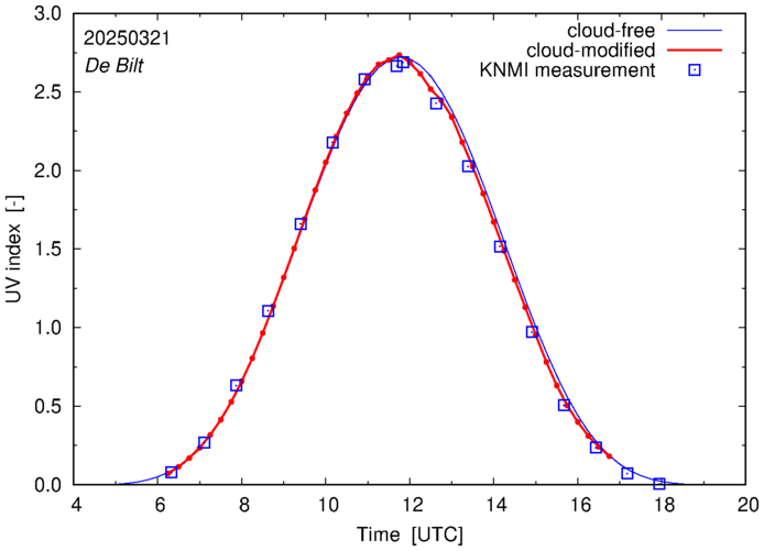 Comparison of the cloud-modified UV index with RIVM and KNMI UV index measurements is based on the higher resolution (0.05 by 0.05°) data using the location of 'De Bilt' for both institutes and is available up to yesterday.