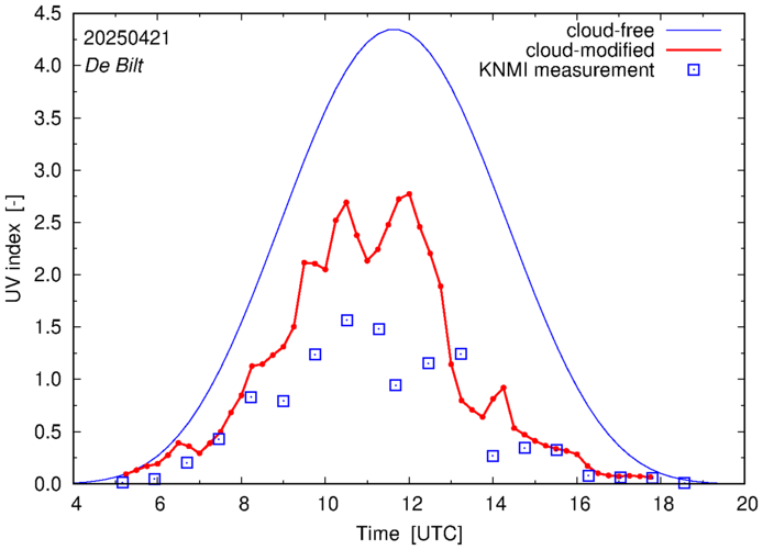 Comparison of the cloud-modified UV index with RIVM and KNMI UV index measurements is based on the higher resolution (0.05 by 0.05°) data using the location of 'De Bilt' for both institutes and is available up to yesterday.