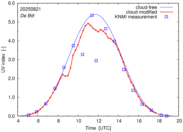 Comparison of the cloud-modified UV index with RIVM and KNMI UV index measurements is based on the higher resolution (0.05 by 0.05°) data using the location of 'De Bilt' for both institutes and is available up to yesterday.