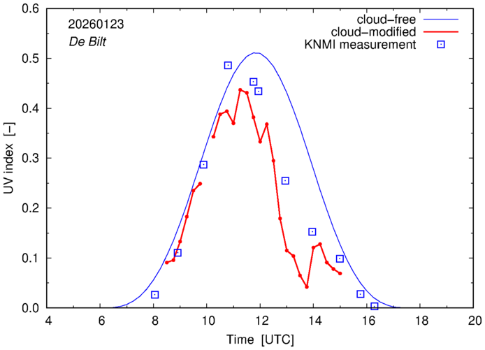 Comparison of the cloud-modified UV index with RIVM and KNMI UV index measurements is based on the higher resolution (0.05 by 0.05°) data using the location of 'De Bilt' for both institutes and is available up to yesterday.