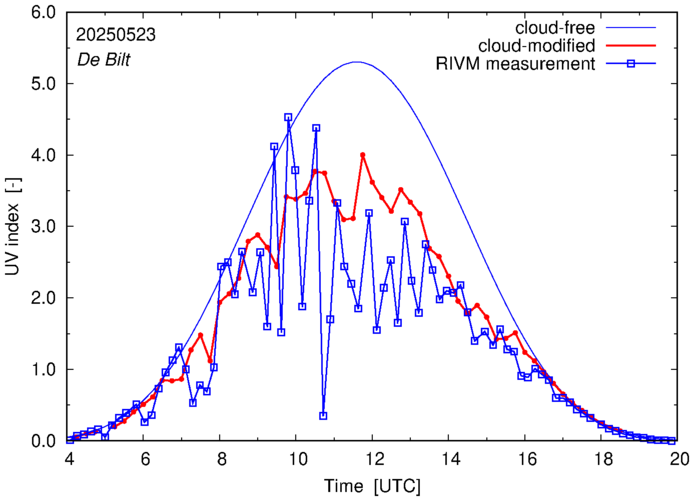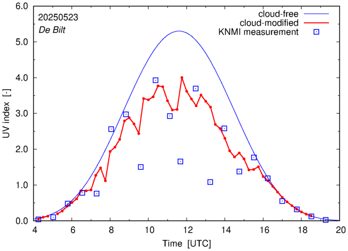 Comparison of the cloud-modified UV index with RIVM and KNMI UV index measurements is based on the higher resolution (0.05 by 0.05°) data using the location of 'De Bilt' for both institutes and is available up to yesterday.