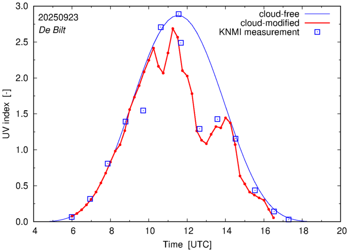 Comparison of the cloud-modified UV index with RIVM and KNMI UV index measurements is based on the higher resolution (0.05 by 0.05°) data using the location of 'De Bilt' for both institutes and is available up to yesterday.