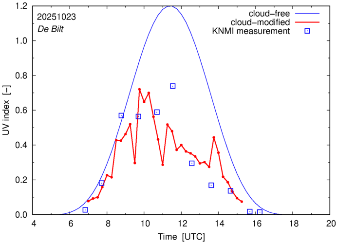 Comparison of the cloud-modified UV index with RIVM and KNMI UV index measurements is based on the higher resolution (0.05 by 0.05°) data using the location of 'De Bilt' for both institutes and is available up to yesterday.