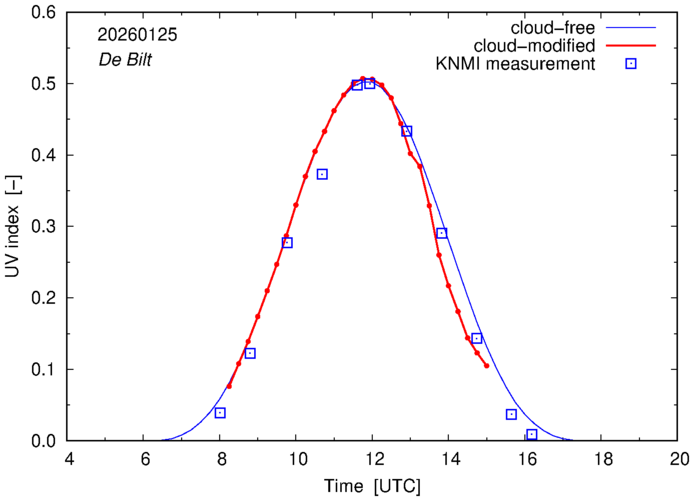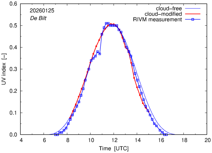 Comparison of the cloud-modified UV index with RIVM and KNMI UV index measurements is based on the higher resolution (0.05 by 0.05°) data using the location of 'De Bilt' for both institutes and is available up to yesterday.