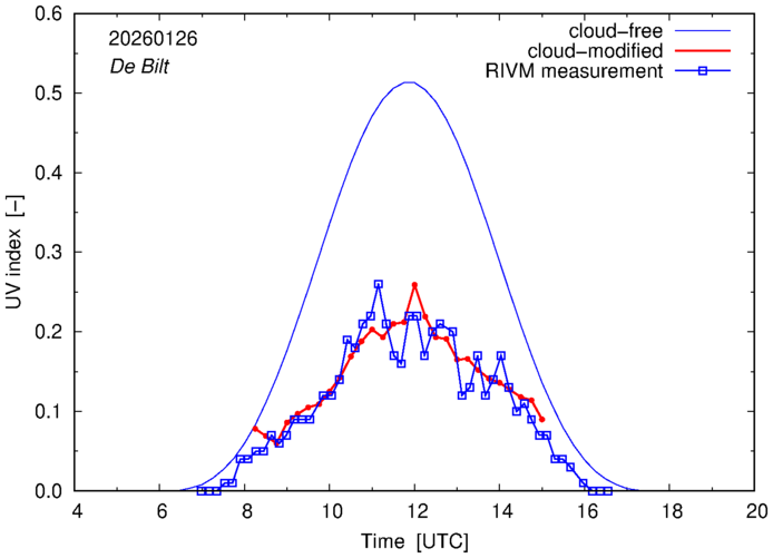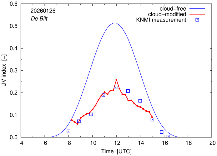 Comparison of the cloud-modified UV index with RIVM and KNMI UV index measurements is based on the higher resolution (0.05 by 0.05°) data using the location of 'De Bilt' for both institutes and is available up to yesterday.