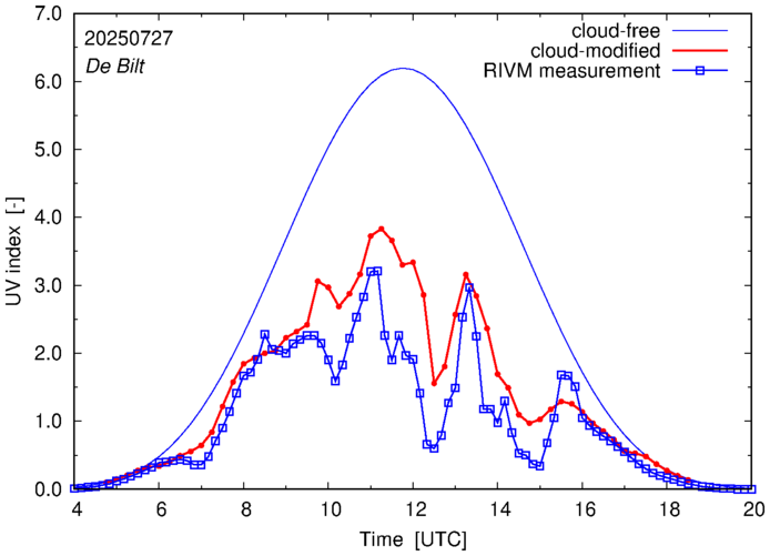 Comparison of the cloud-modified UV index with RIVM and KNMI UV index measurements is based on the higher resolution (0.05 by 0.05°) data using the location of 'De Bilt' for both institutes and is available up to yesterday.
